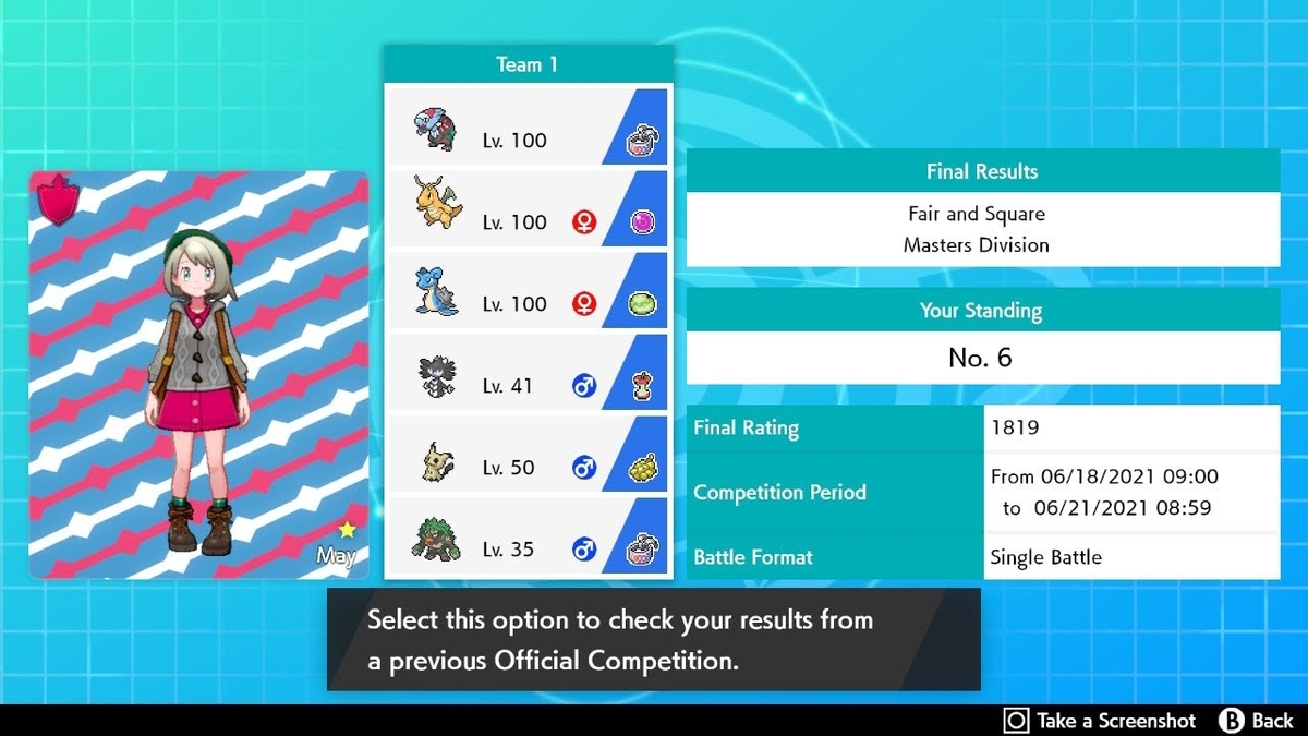 ダイマ要員2。パッチラゴンやゴリランダー等ラプラスに投げづらいポケモンがいるときに選出。そのためパッチラゴンを迅速に処理できる逆鱗を採用。技範囲が狭めだが出す構築が限られているので問題なし。本当は精神力の方がいいだろうけど育成めんどいのでマルスケ。(多分)このポケモンのせいで初手ポリ2がめちゃくちゃ多かった。2回出したのでラブボを持たせるわけにはいかなかった。